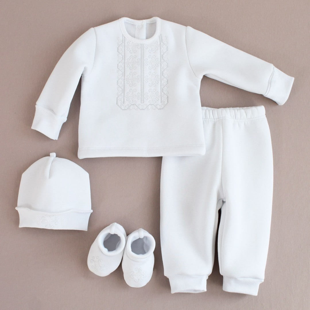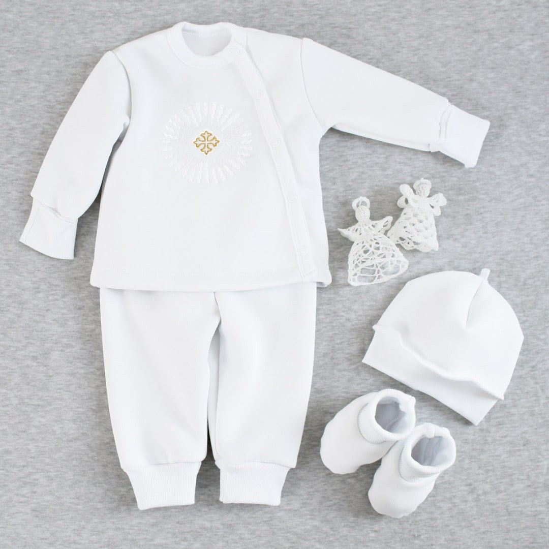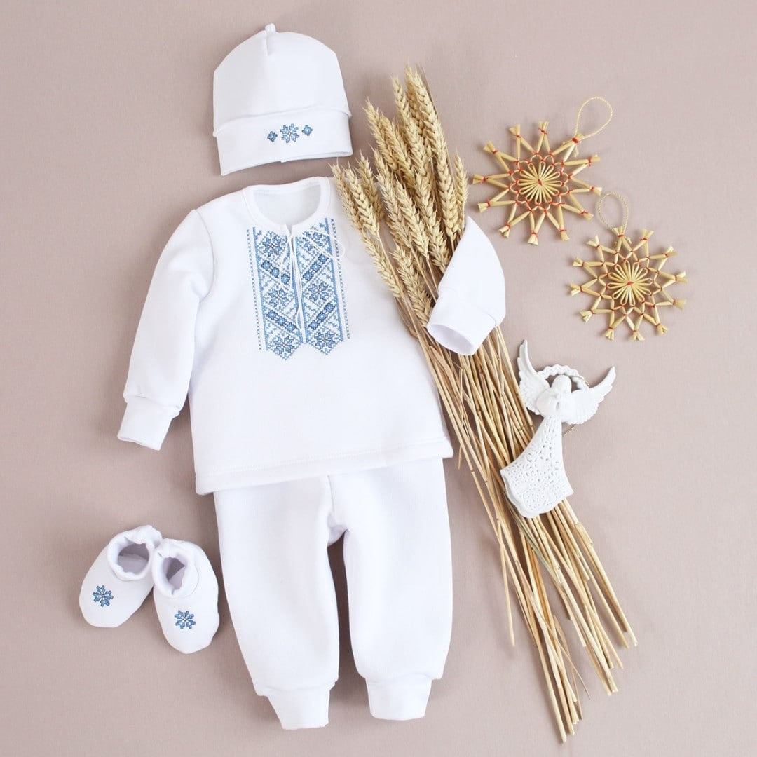 Christening Set for Baby Boy – a delicate 4-piece outfit designed for your little one’s special day. Made from soft, breathable cotton blend, the set includes a long-sleeve shirt with embroidery, comfortable pants, a matching hat, and booties. Gentle to baby’s skin, this outfit combines traditional symbolism with modern comfort, making it perfect for baptism, christening, or dedication ceremonies.