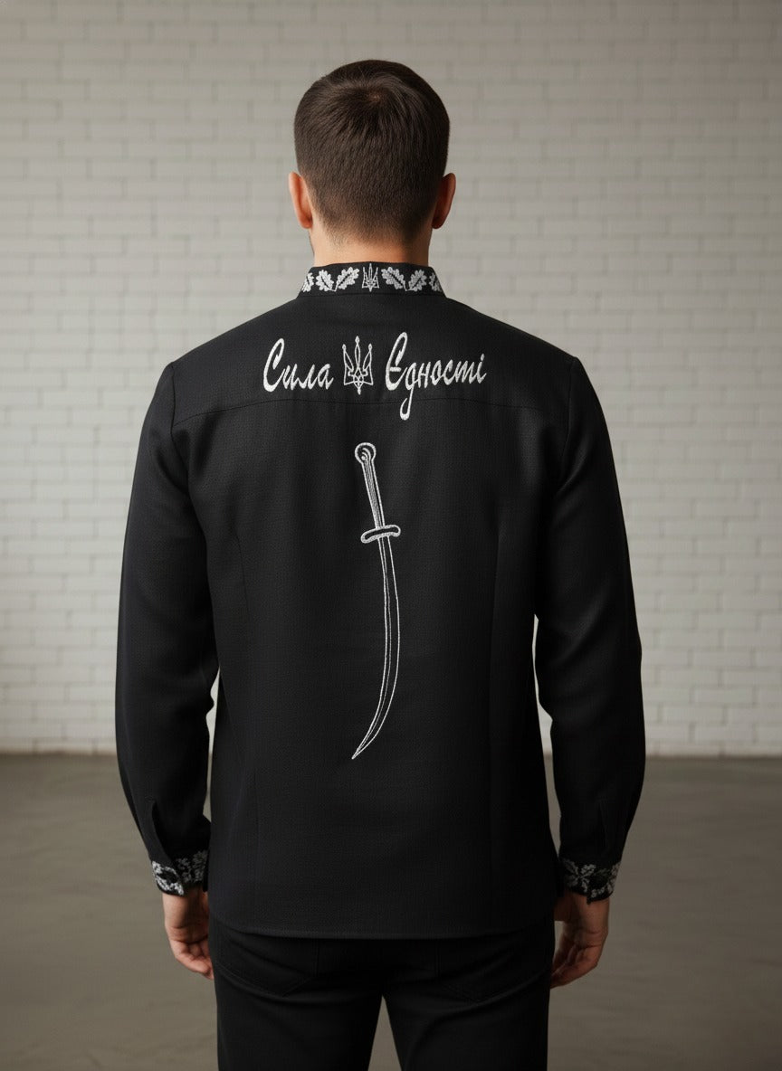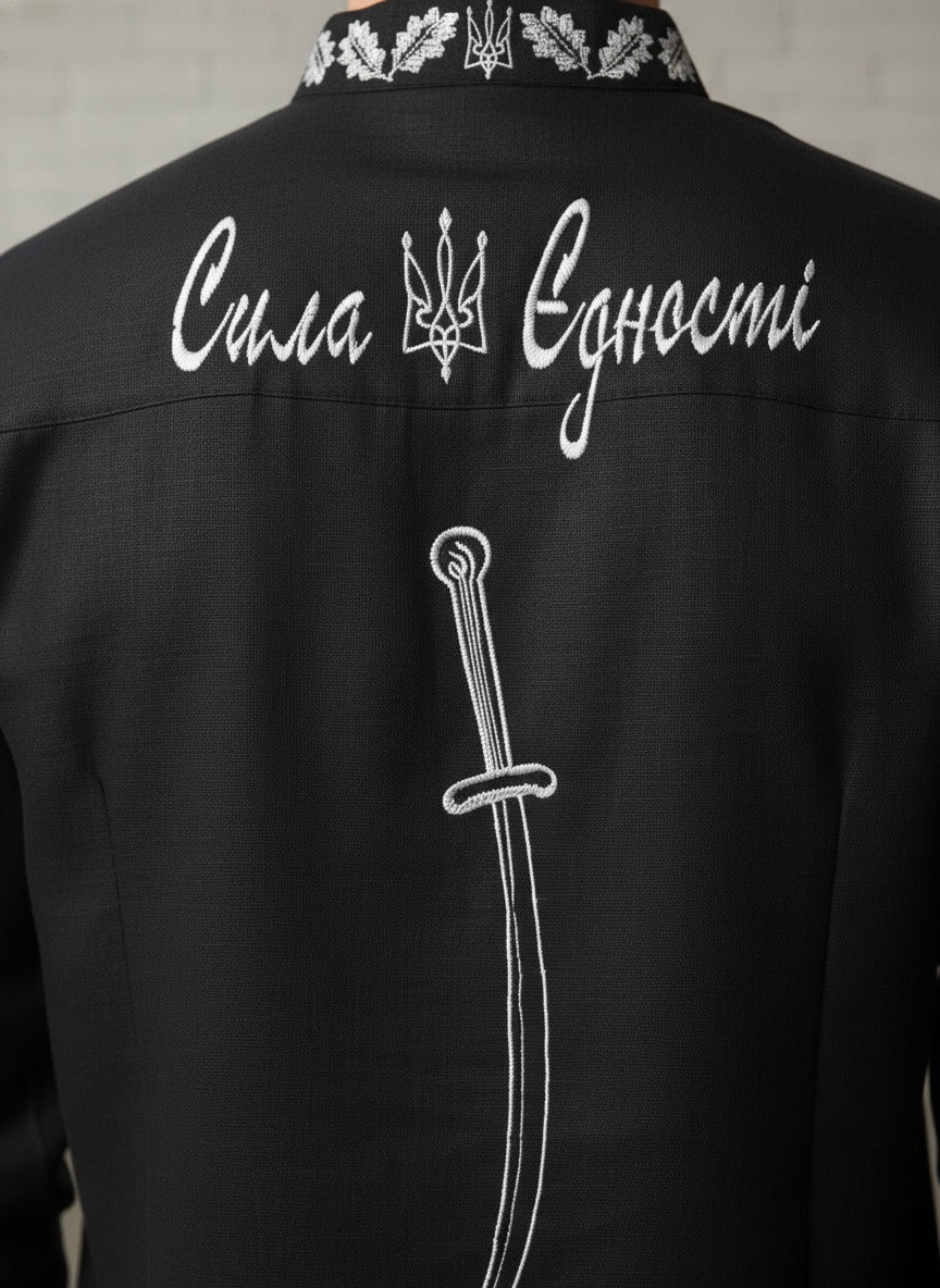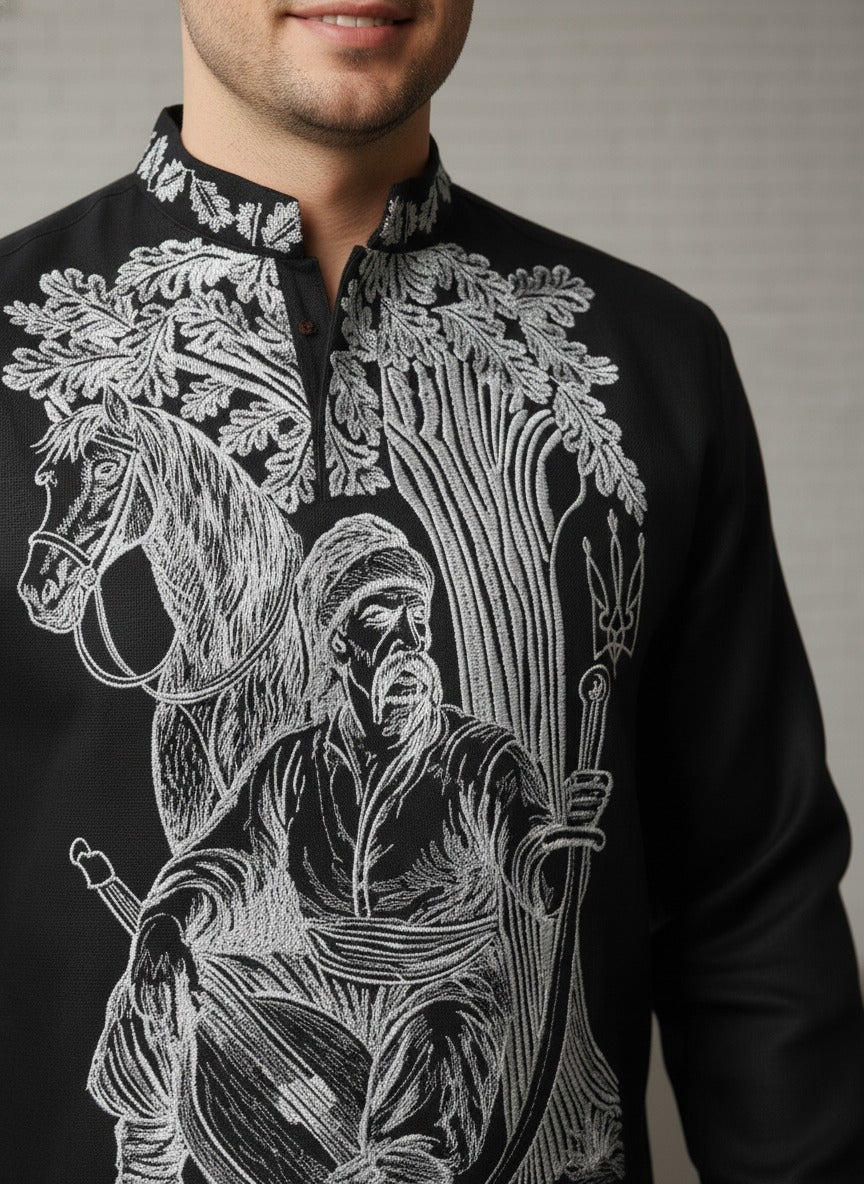 Designer Ukrainian Vyshyvanka for Men – Black Embroidered Shirt with Cossack Design