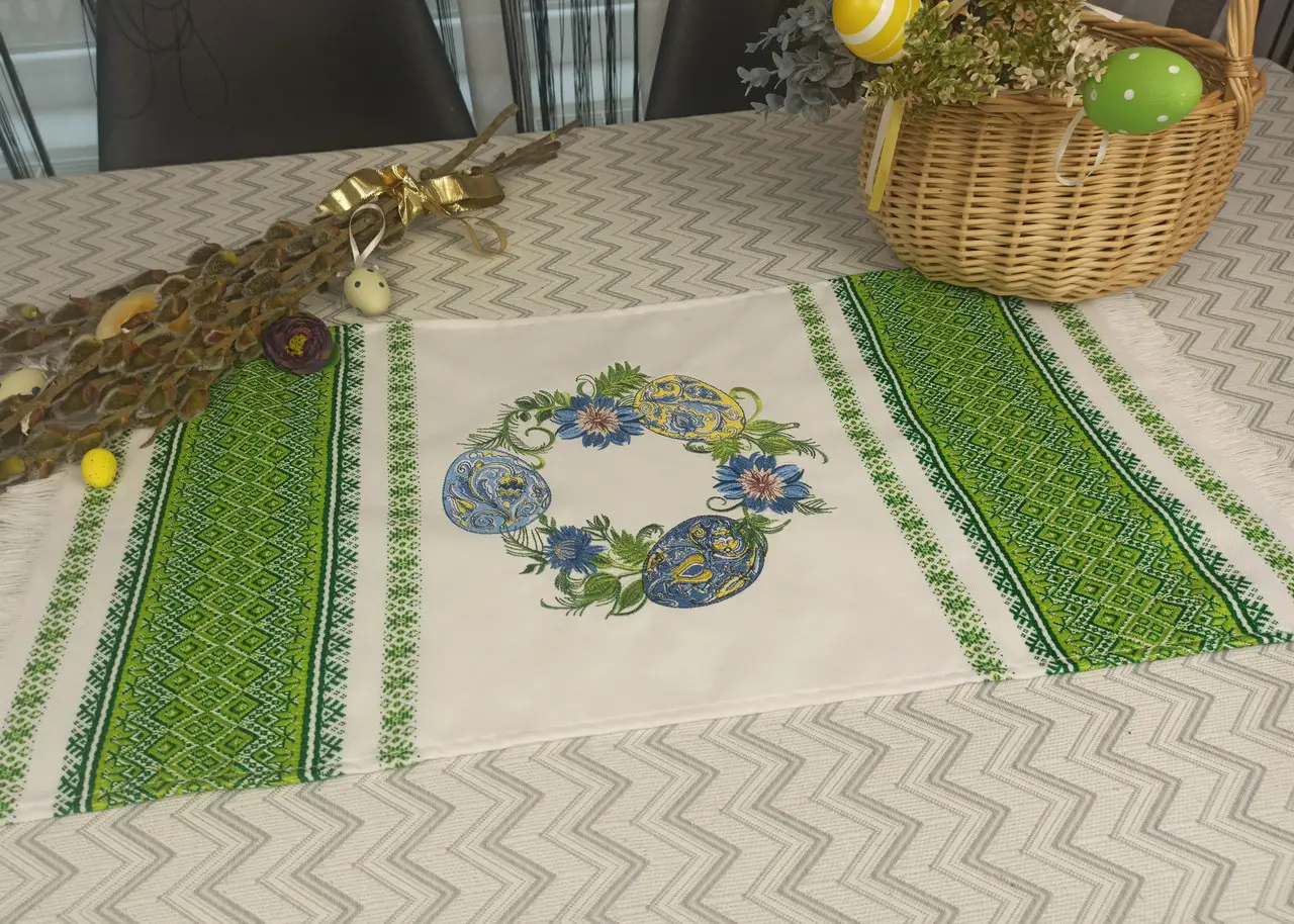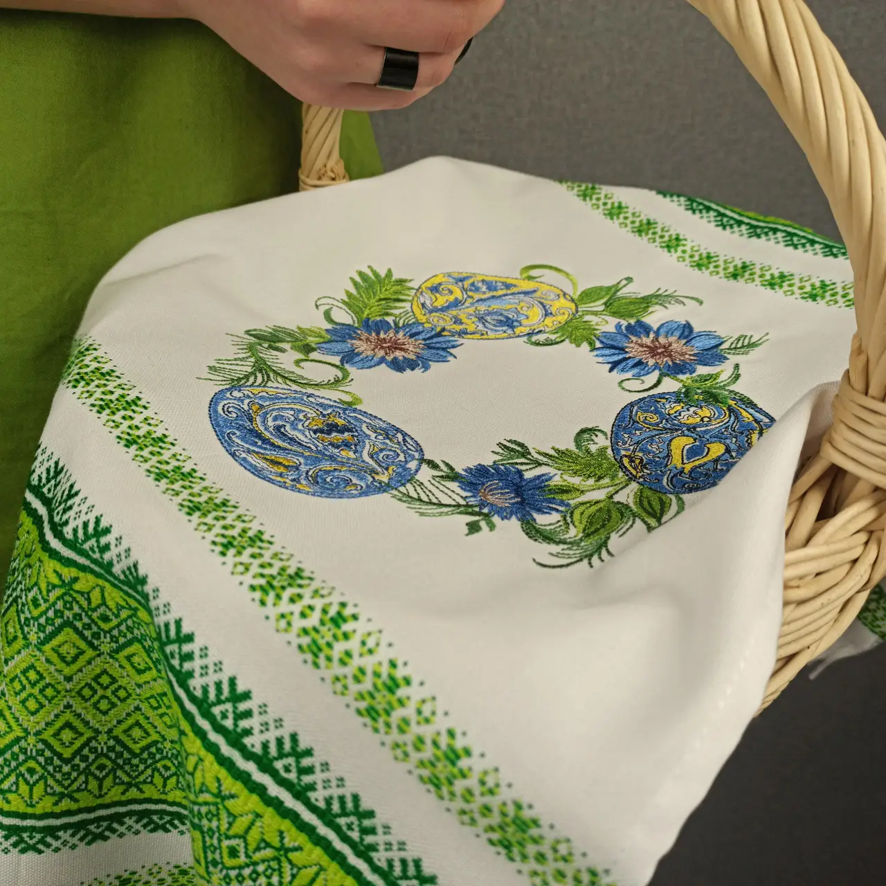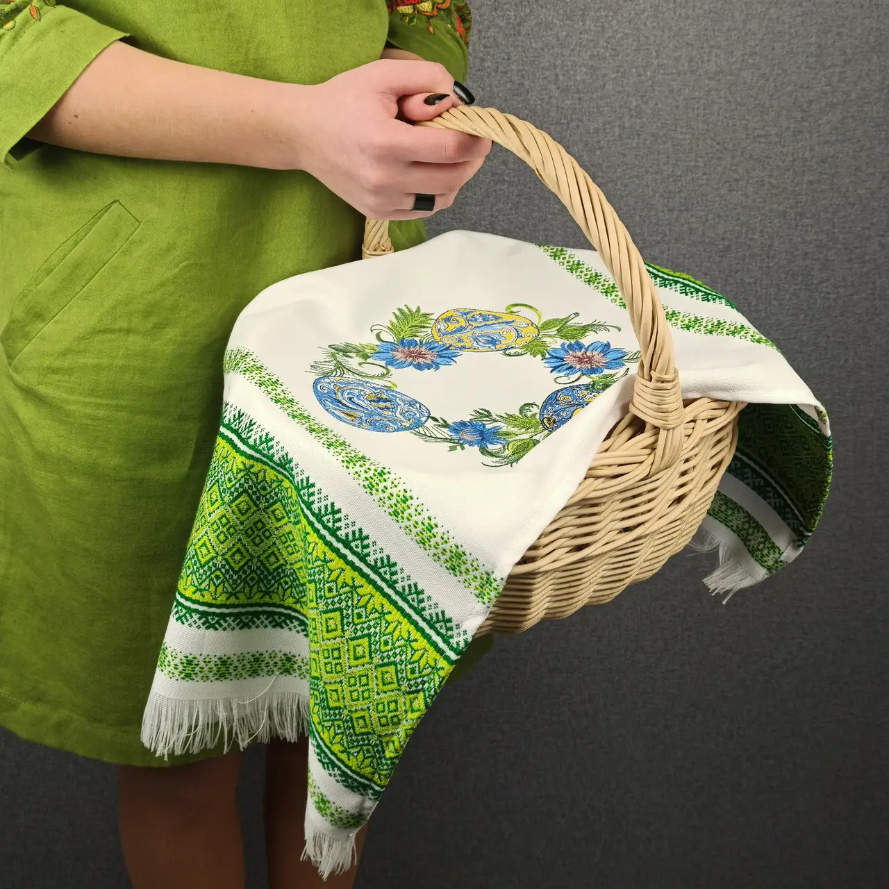 Elevate your Easter celebrations with our exquisite Easter towel. This intricately embroidered piece features a stunning centerpiece adorned with smooth embroidery, surrounded by a vibrant green fabric ornamentation along the edges. The green ornamentation of the woven Easter towel complements the lively embroidery beautifully, showcasing an engaging fusion of floral motifs and vintage pysanky designs. Welcome the joyous spirit of Easter into your home with this timeless and elegant piece, perfect for adding a touch of tradition and charm to your festivities.