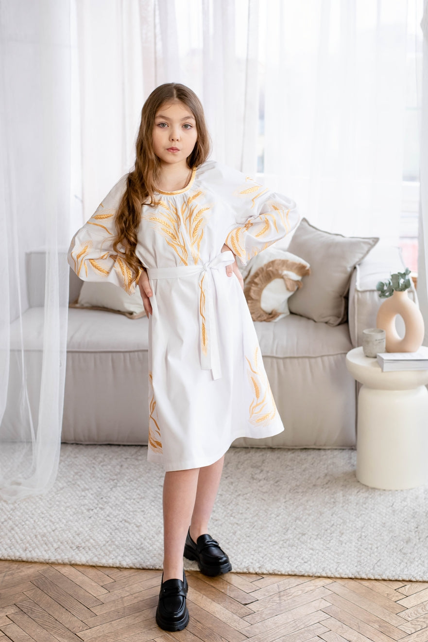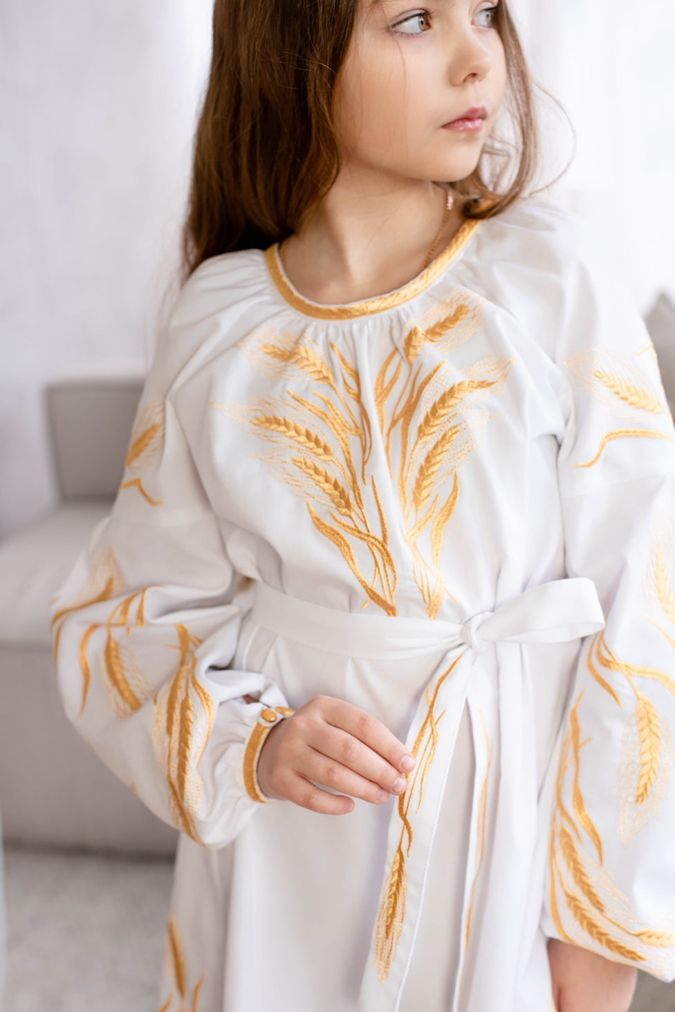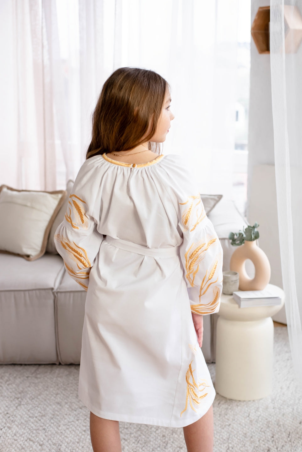 This elegant dress is crafted from natural white homespun fabric, perfect for lovers of ethnic style and comfort. Featuring airy puff sleeves and golden wheat embroidery that symbolizes abundance and a deep connection with nature, it brings both grace and meaning to your wardrobe.