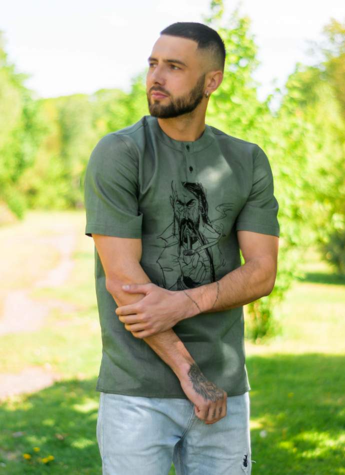 Embroidered Shirt for Various Age Groups, Made of Smoothly Dyed Linen Fabric with a Central Fastening. The shirt features a patriotic-style embroidery on the front. The design of the shirt is loose-fitting and it beautifully contours to the body. The neckline is finished with a contrasting stitch, giving the shirt a sporty touch.