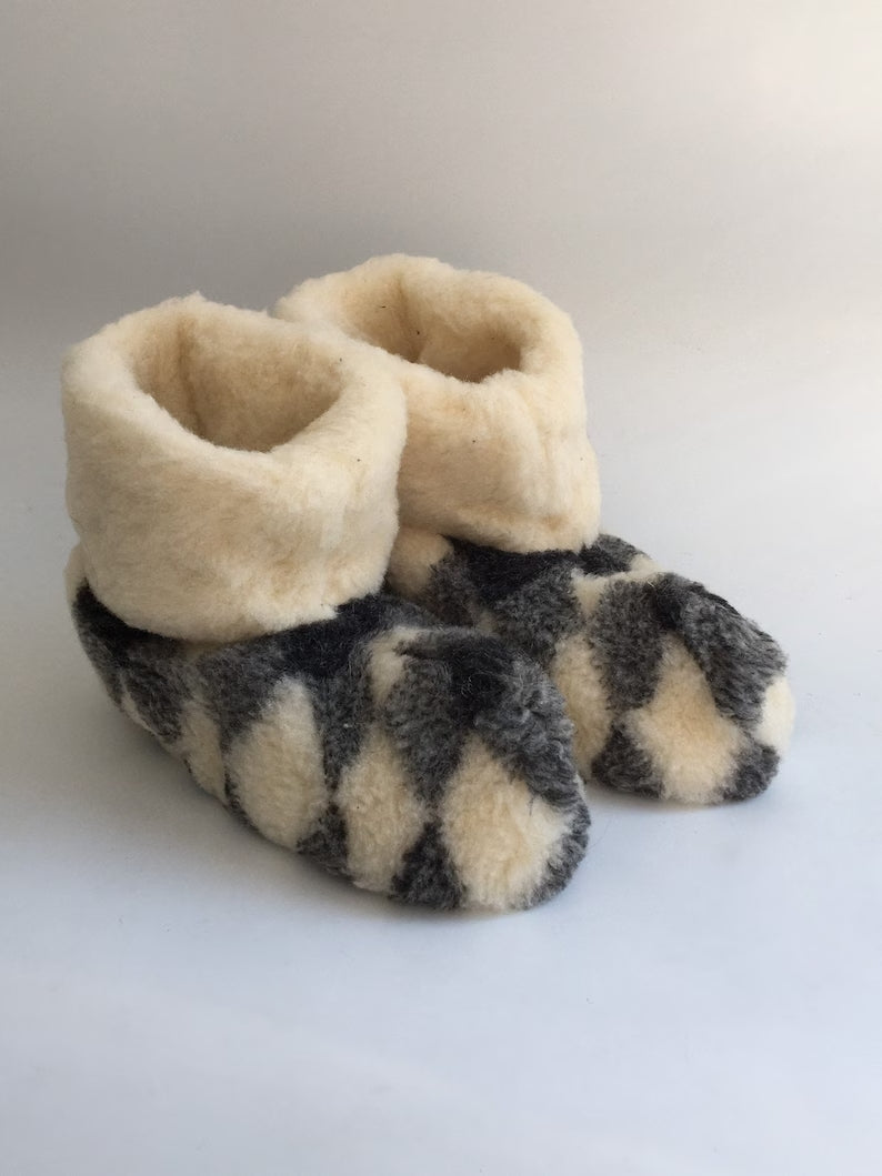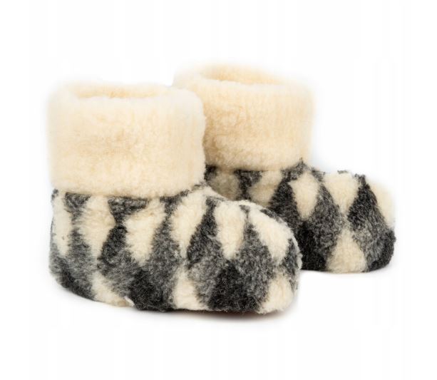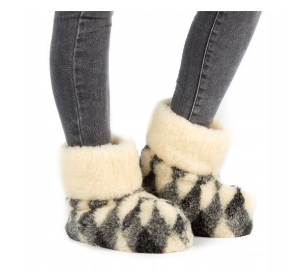 Merino wool slippers with suede leather soles. These slippers are incredibly comfortable and warm. Crafted from the finest merino wool, they are soft to the touch and non-itchy. In today's world, where synthetic materials abound, those with allergies to synthetics find wool products more friendly. Wool items are hypoallergenic, safe for children, and recommended for treating rheumatism and arthritis. Additionally, they regulate body temperature, prevent excessive sweating through excellent ventilation, and absorb moisture. The wool fibers are coated with lanolin, preventing dirt penetration. Wool products, derived from sheep, are widely used for rehabilitation after illnesses.