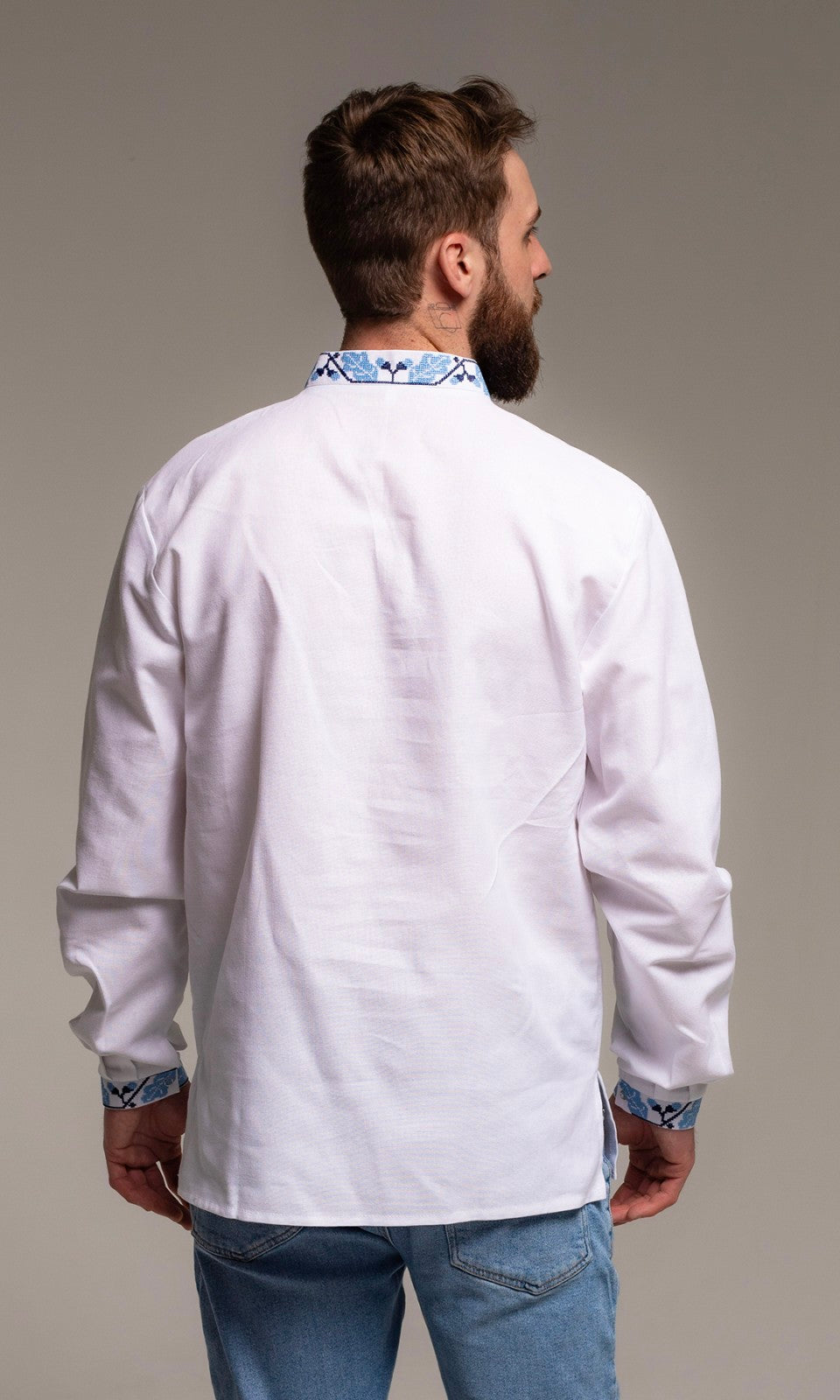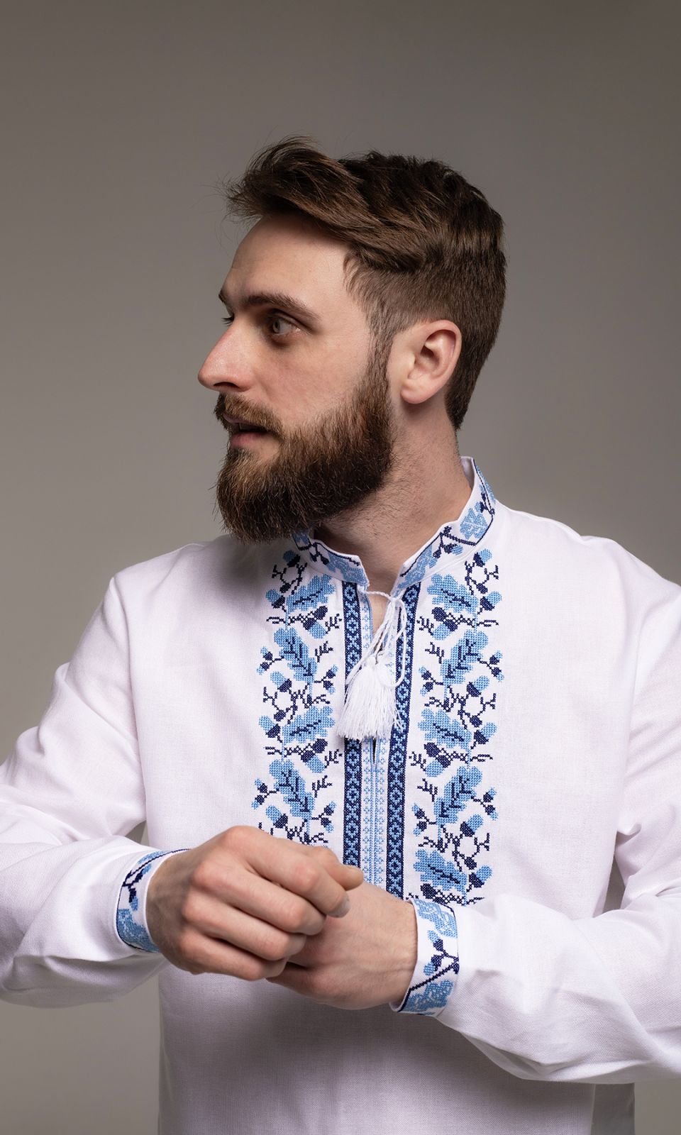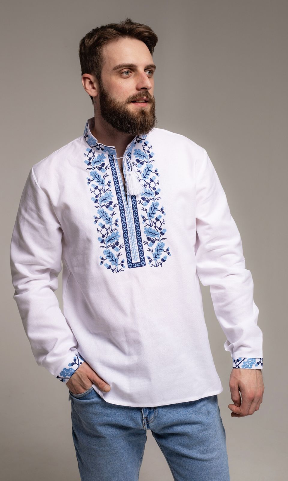 This men's vyshyvanka features a sophisticated oak pattern embroidered in shades of blue on white fabric. The detailed design showcases a mix of botanical motifs that are elegantly arranged around the collar, down the chest, and at the cuffs. The shirt is crafted with a straight fit, a tasseled tie at the neck, and long sleeves, making it a perfect blend of traditional Ukrainian craftsmanship and contemporary fashion. Ideal for cultural gatherings or as a distinctive addition to a modern wardrobe.