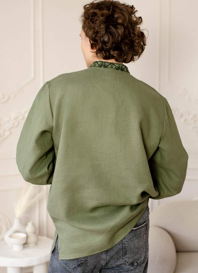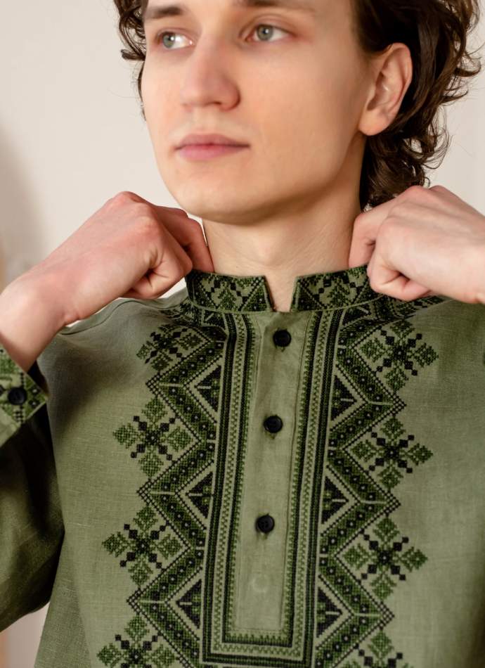 Men’s embroidered shirt is made from breathable, lightweight linen—ideal for warm weather. Black and green geometric embroidery adds a bold contrast, blending traditional Ukrainian patterns with a contemporary silhouette. The refined lines highlight elegance and style, while the natural fabric guarantees comfort throughout the day.
