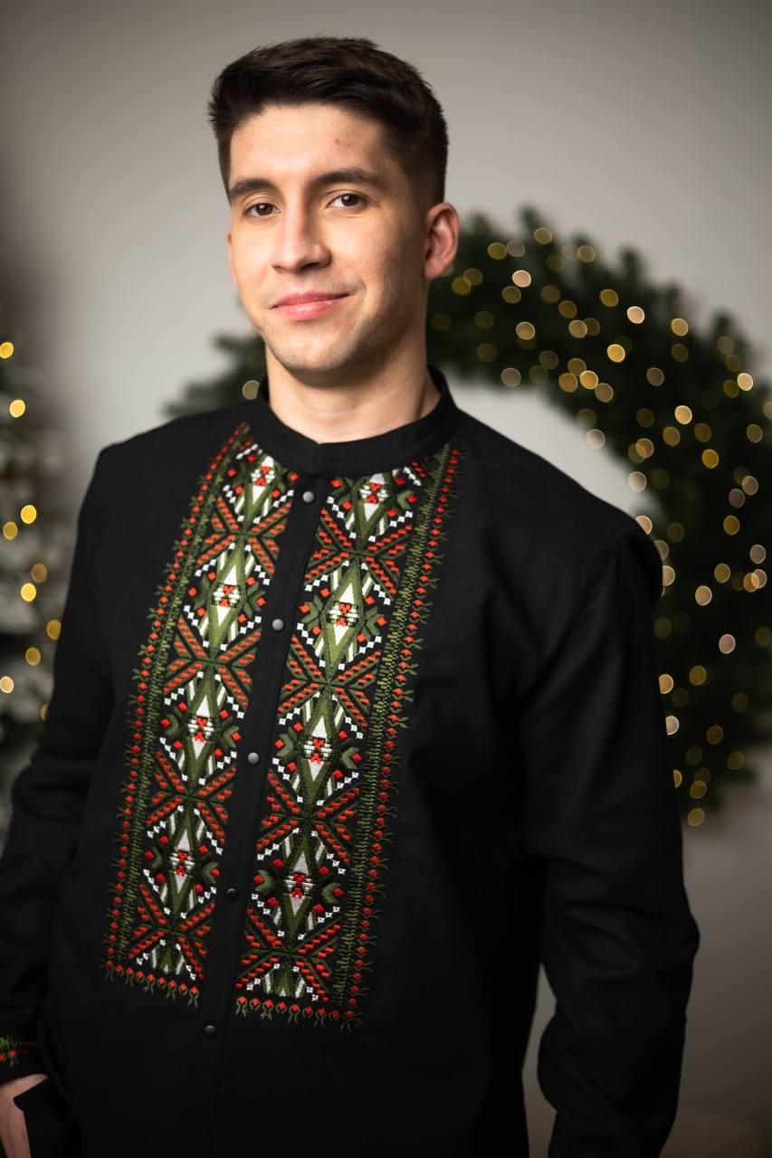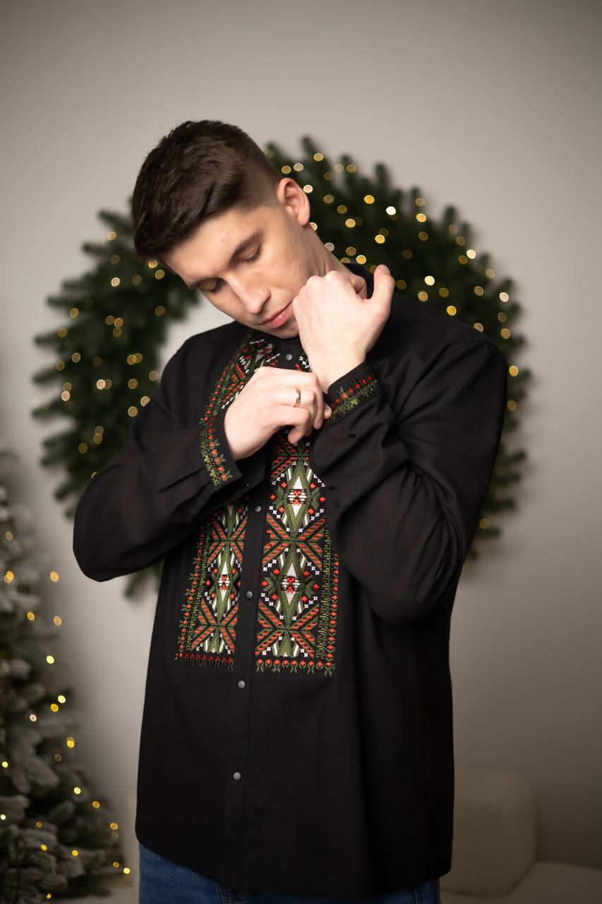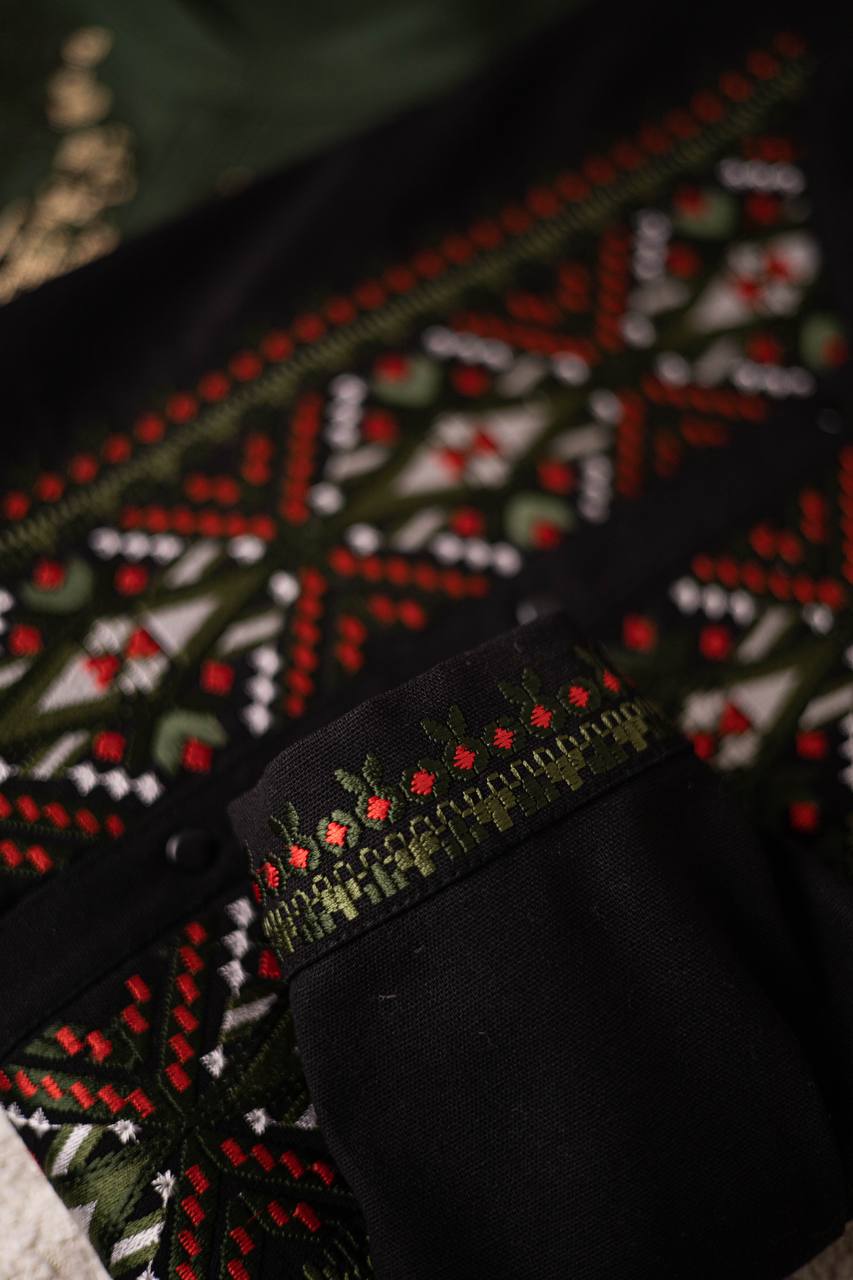 Men's embroidered shirt crafted from high-quality linen, combining comfort and Ukrainian traditions. The exquisite red and green ornament symbolizes strength, unity, and a connection to national culture. The embroidery details on the chest and cuffs are inspired by authentic folk motifs, adding uniqueness and style to the shirt. Made from natural linen, it ensures lightness and comfort, making it an ideal choice for special occasions such as weddings, festivals, or national celebrations. This shirt highlights your individuality and love for Ukrainian culture.