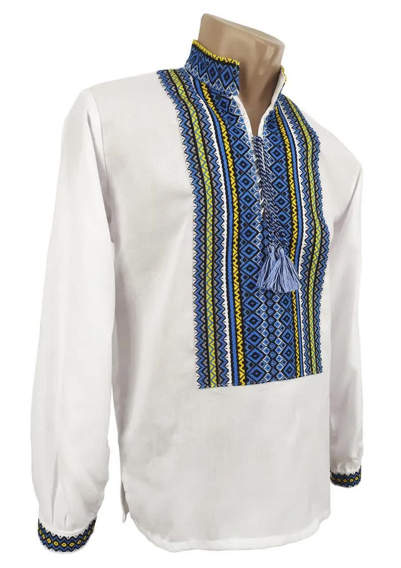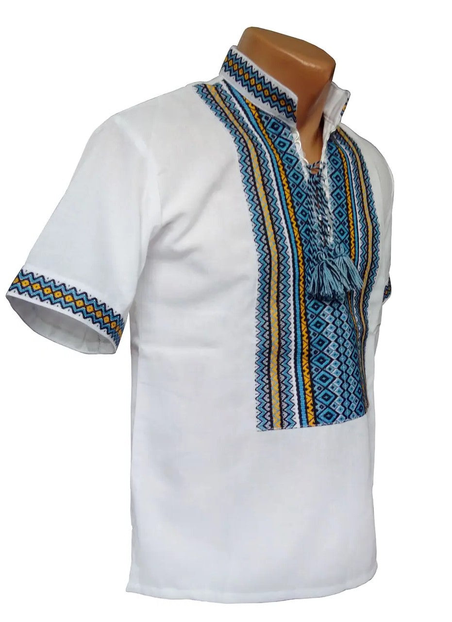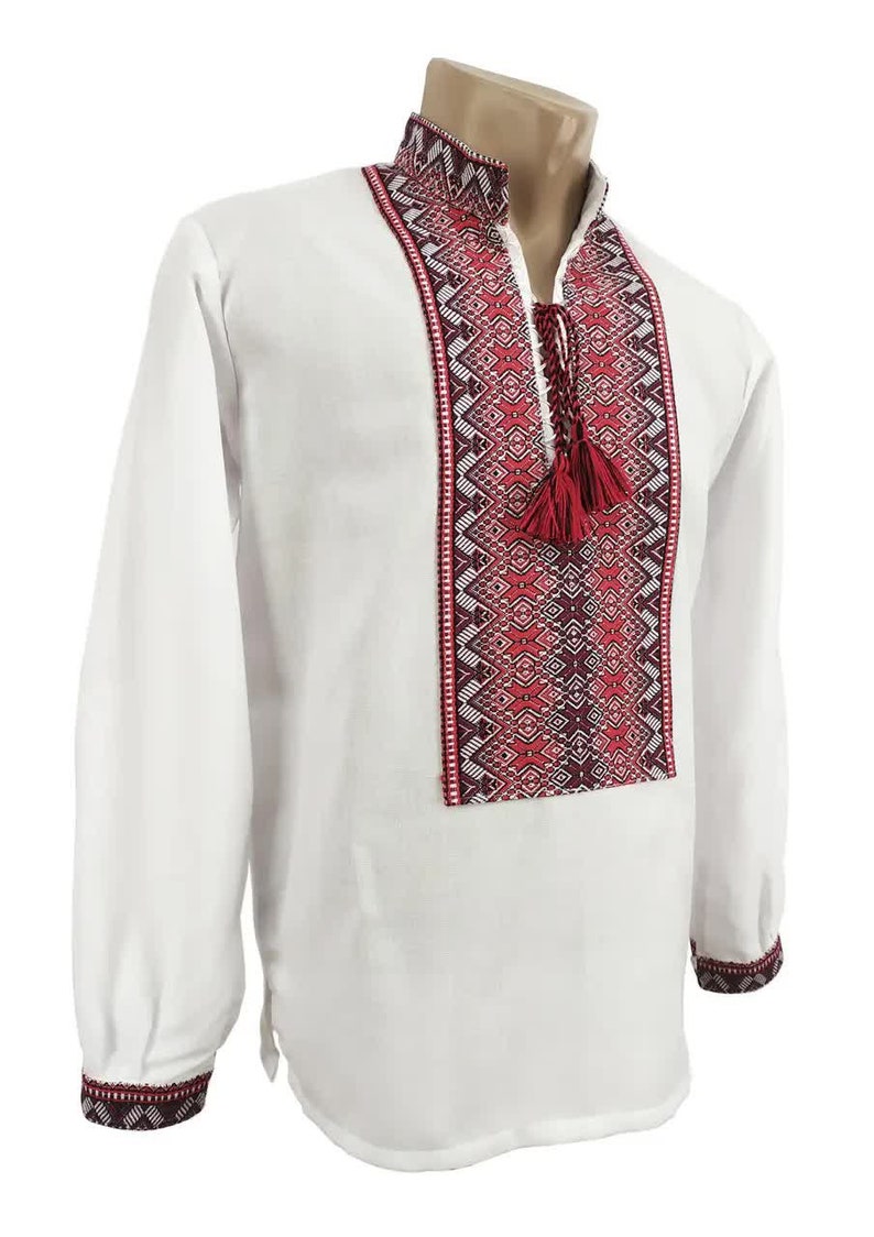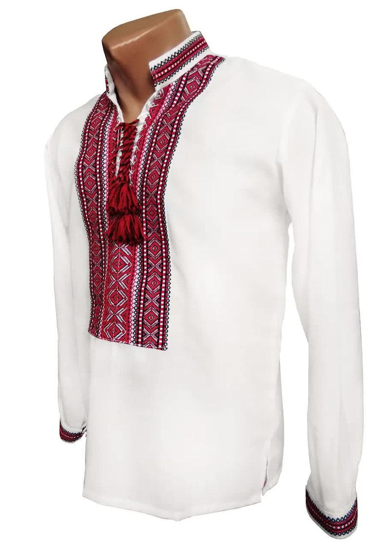 This men's embroidered shirt in white color features woven embroidery that adds to its overall appeal. The shirt is adorned with stylish and discreet embroidery in a two-color contrasting ornament, suitable for both festive and everyday wear for men. The high-quality material used to create this shirt is pleasant to the body and fits well. The Ukrainian geometric pattern on the embroidery identifies with folk traditions that have been passed down through generations. This new ethnic collection consists of only first-class embroidered shirts at an affordable price made of natural fabrics. It is perfect for pairing with jeans.