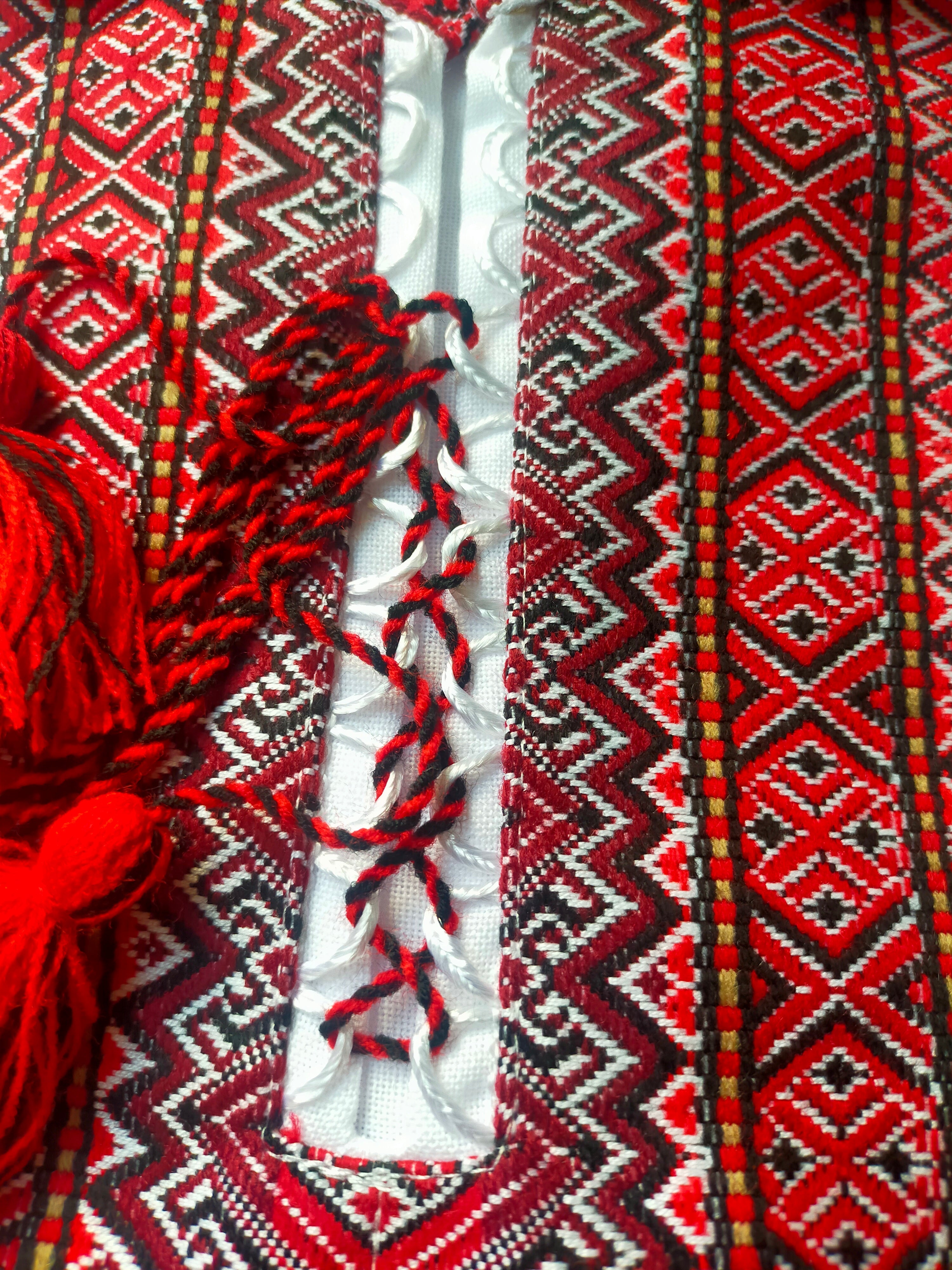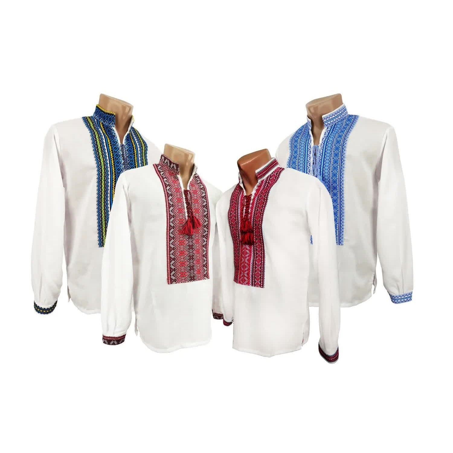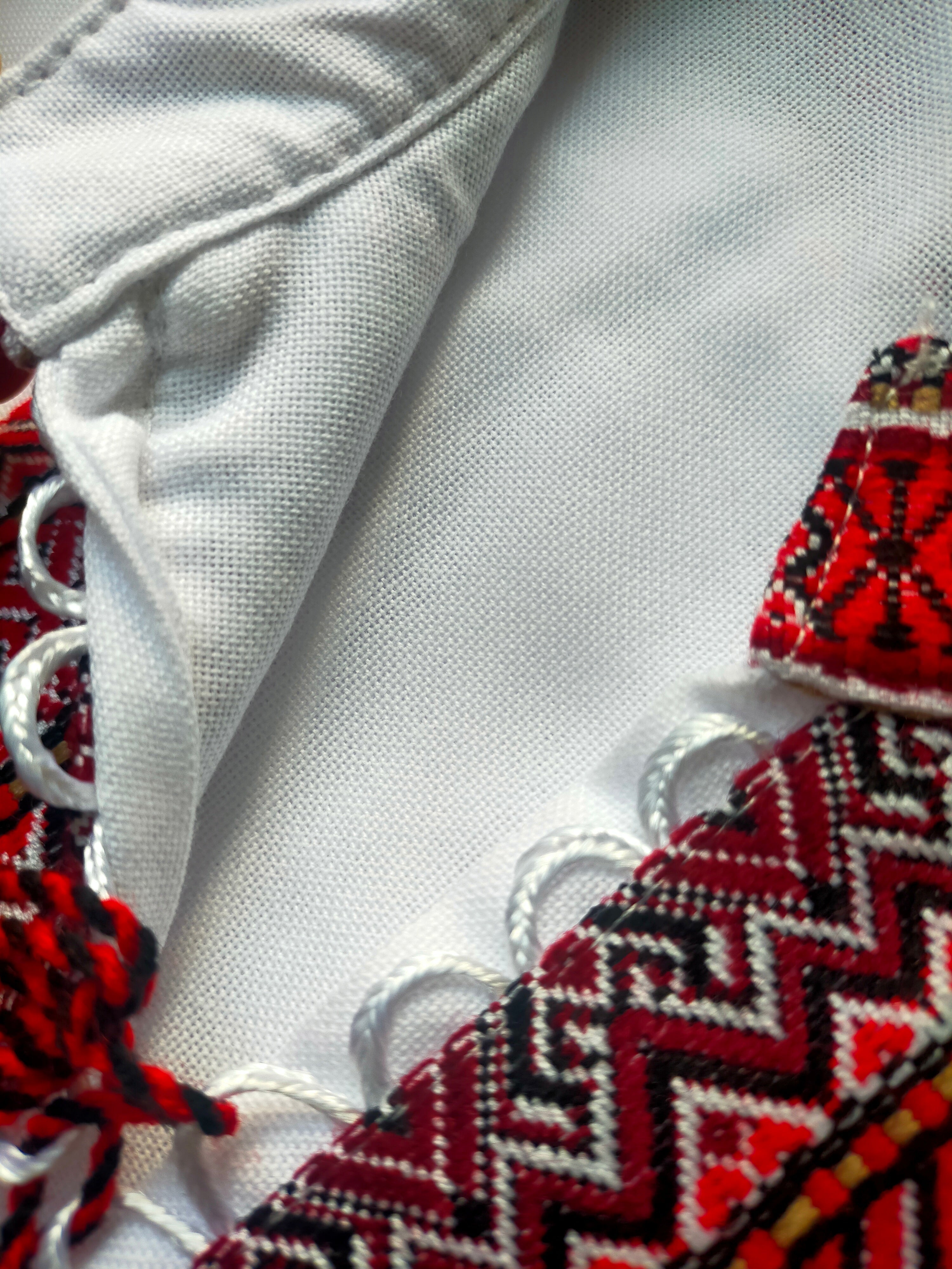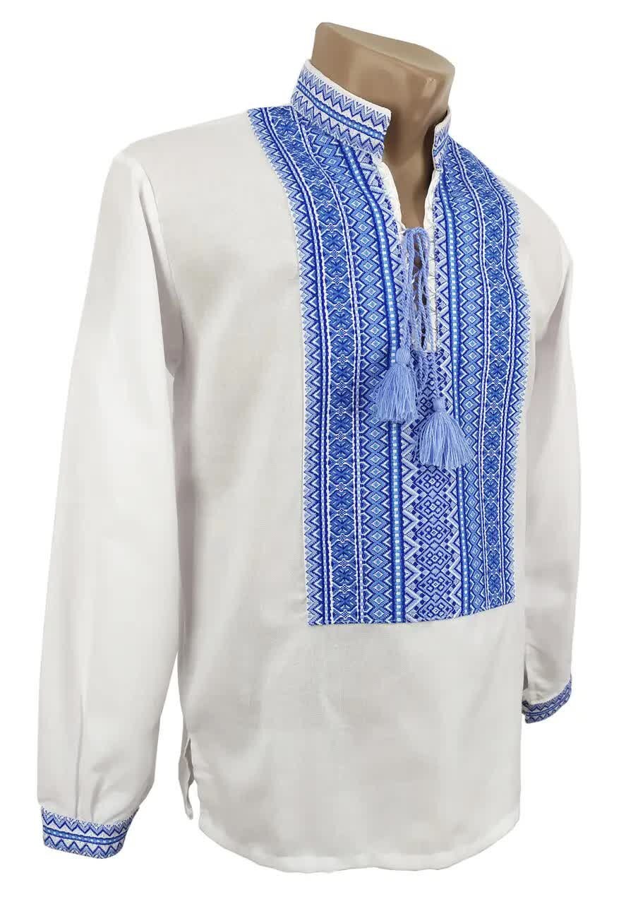 This men's embroidered shirt in white color features woven embroidery that adds to its overall appeal. The shirt is adorned with stylish and discreet embroidery in a two-color contrasting ornament, suitable for both festive and everyday wear for men. The high-quality material used to create this shirt is pleasant to the body and fits well. The Ukrainian geometric pattern on the embroidery identifies with folk traditions that have been passed down through generations. This new ethnic collection consists of only first-class embroidered shirts at an affordable price made of natural fabrics. It is perfect for pairing with jeans.