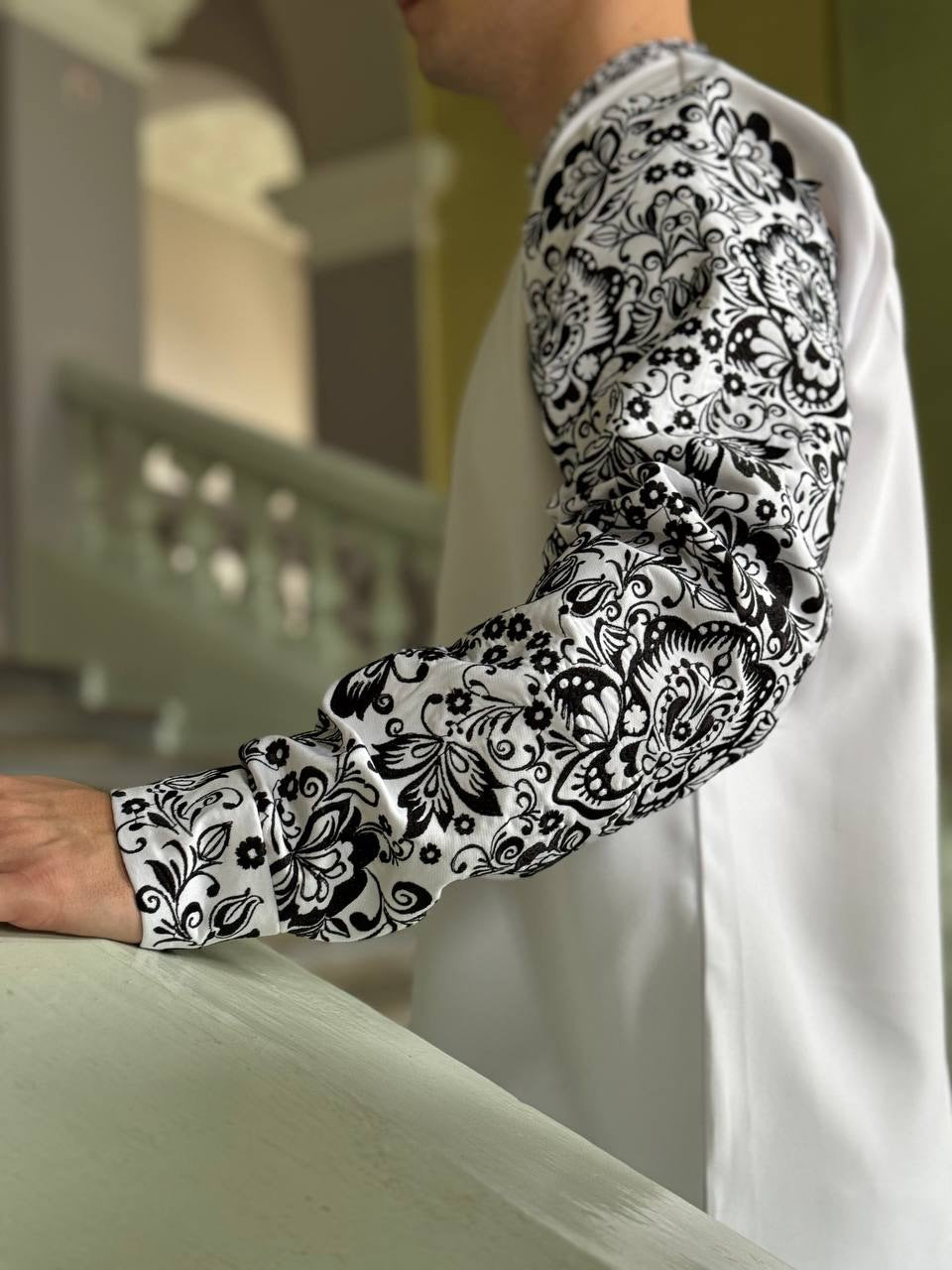 The deep black satin embroidery is precise, restrained, and noble, creating a powerful contrast against the pure white fabric. The ornamental floral pattern adds character and heritage while remaining modern and refined.
