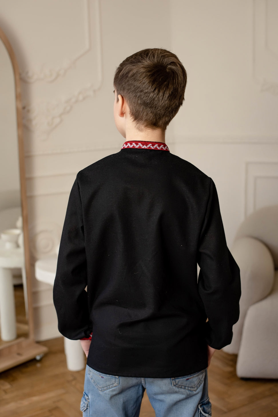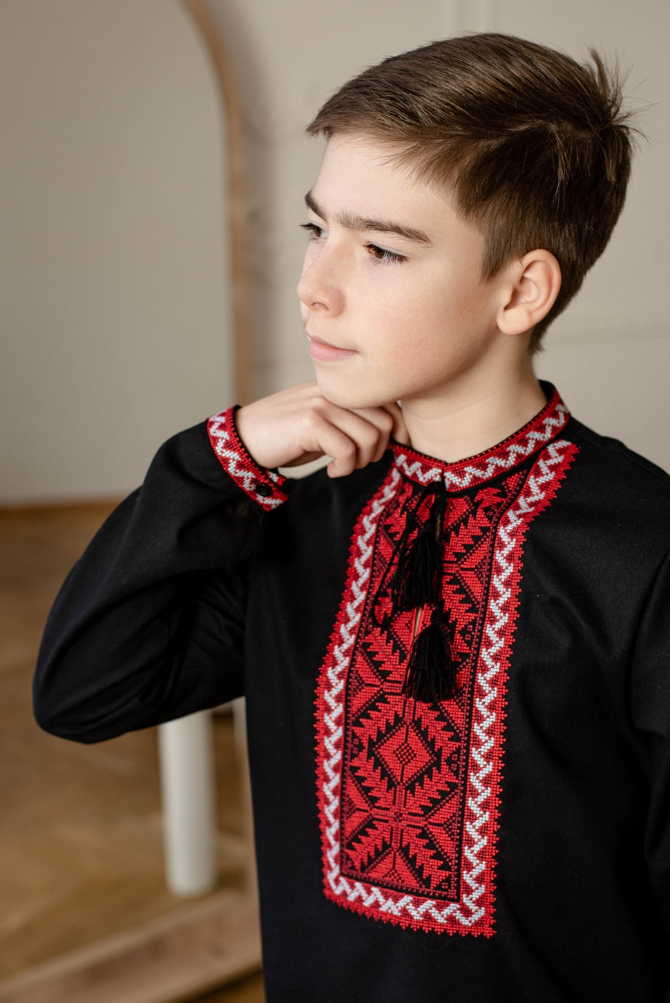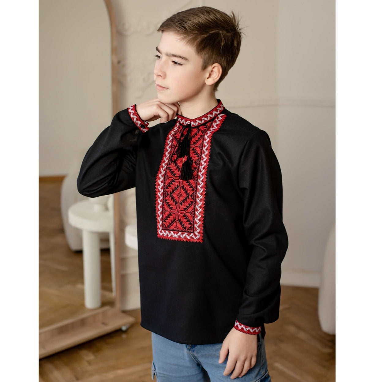 Black Ukrainian vyshyvanka for boys with red embroidery