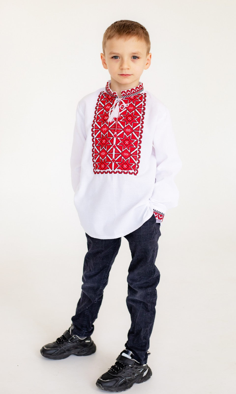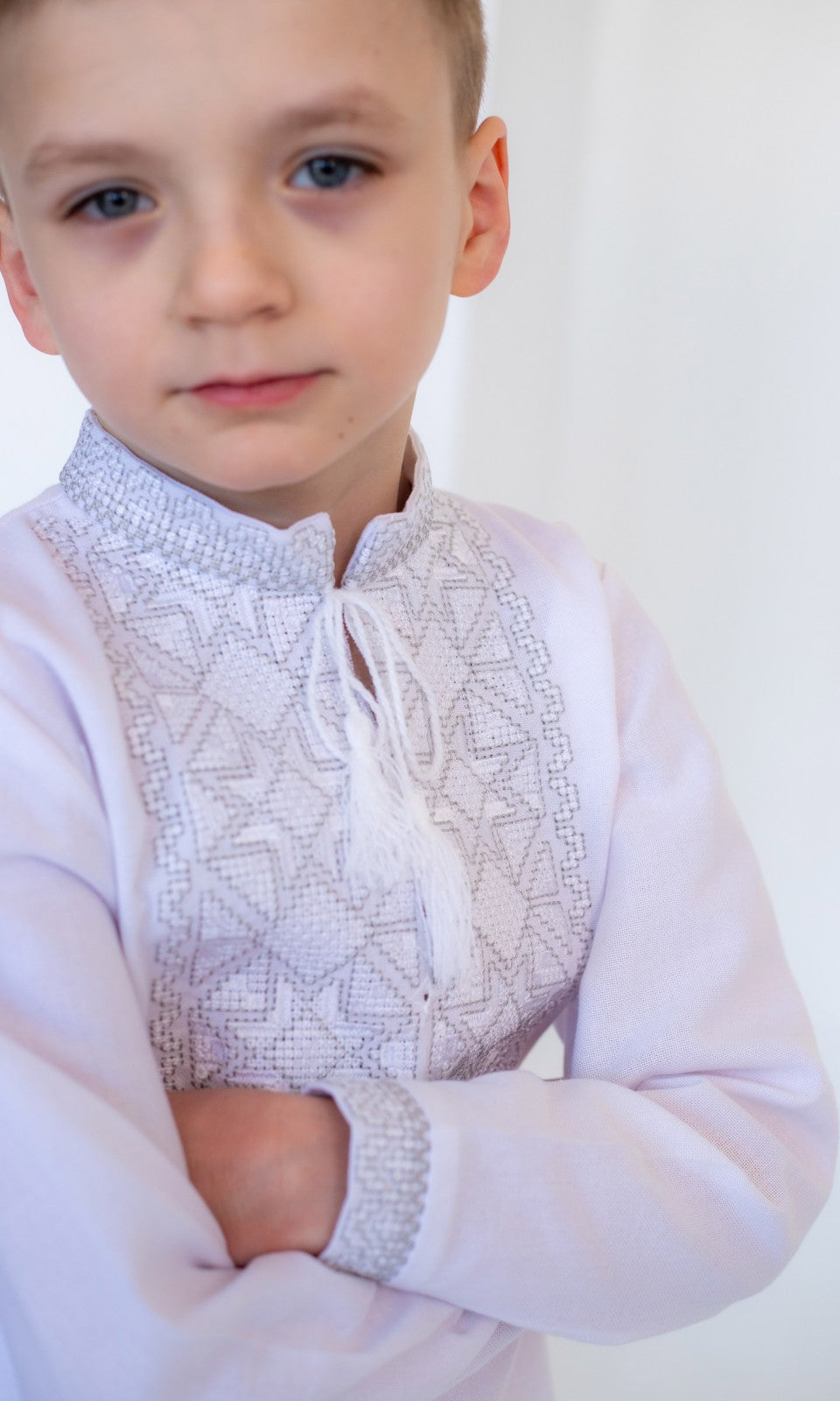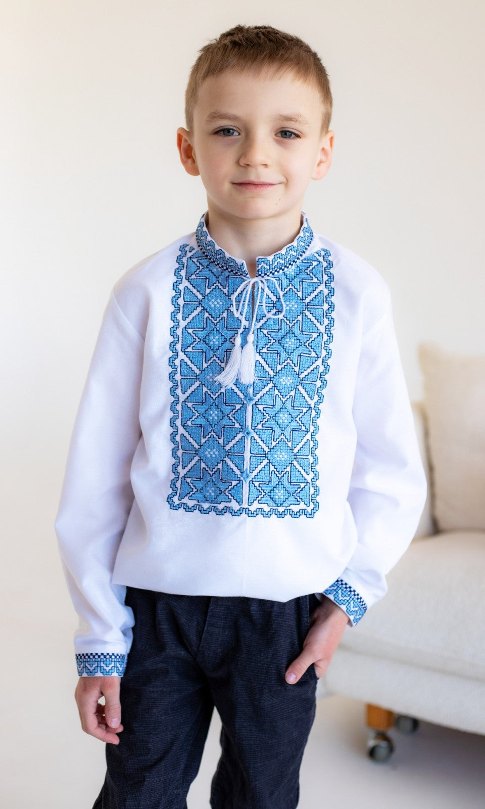This traditional Ukrainian vyshyvanka for boys showcases intricate embroidery in red, blue, or gray-white. Designed for both comfort and charm, it features a loose fit, stand-up collar, tassel-tied neckline, and long sleeves with buttoned cuffs.