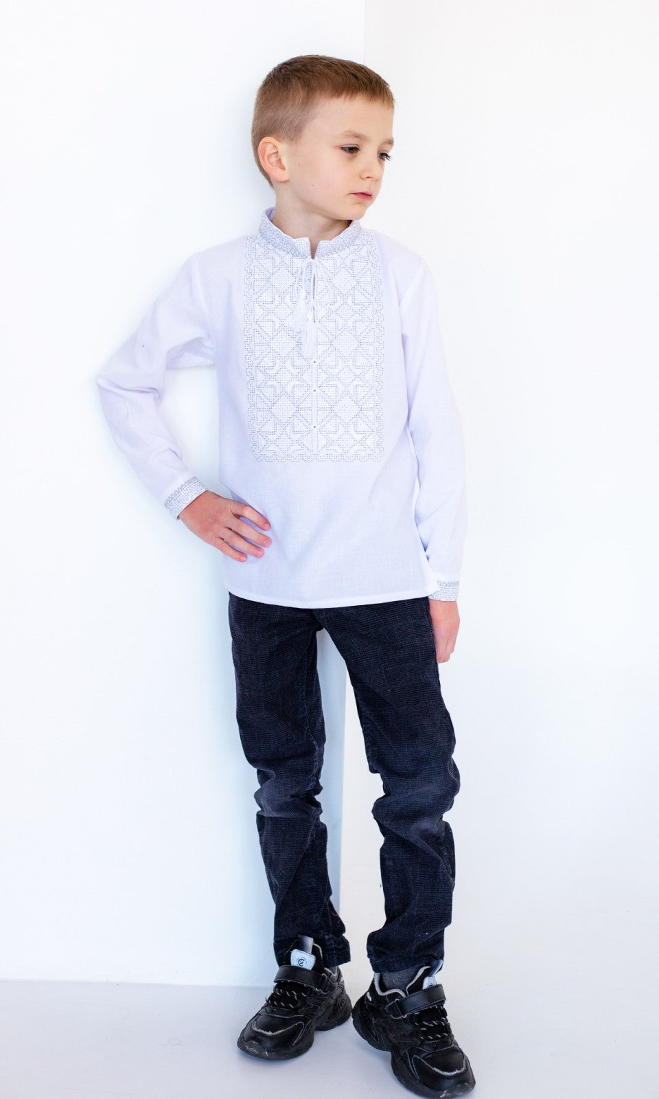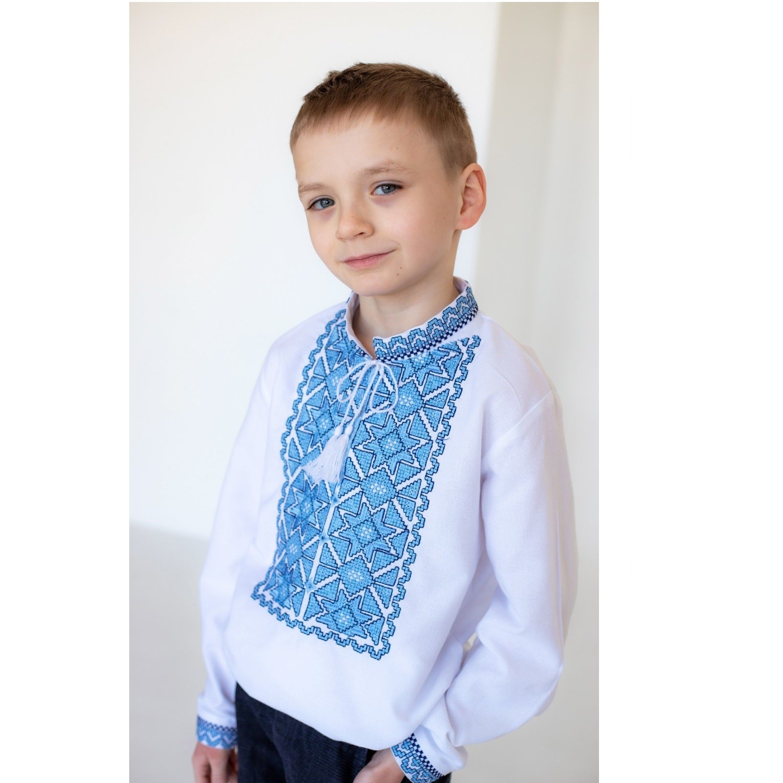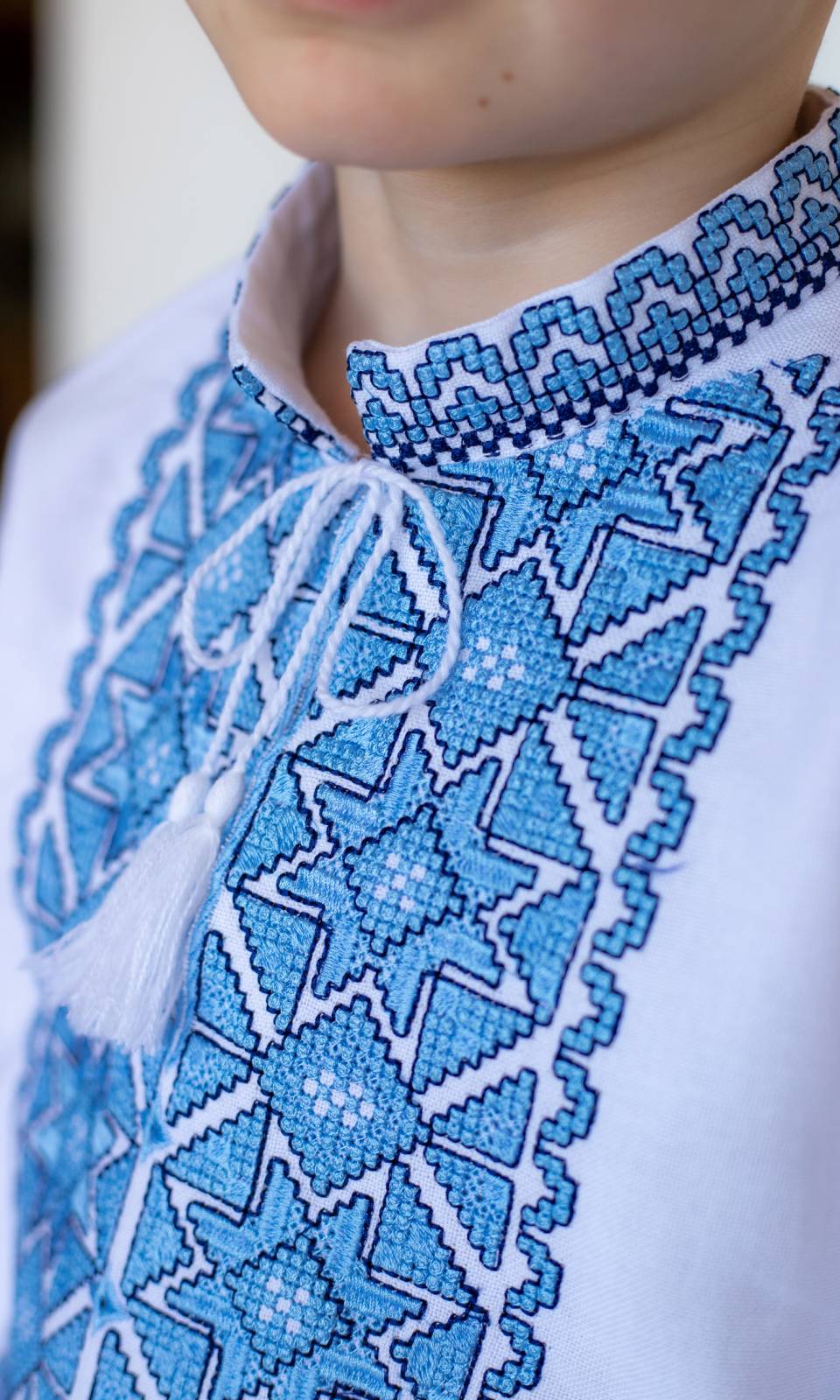 This traditional Ukrainian vyshyvanka for boys showcases intricate embroidery in red, blue, or gray-white. Designed for both comfort and charm, it features a loose fit, stand-up collar, tassel-tied neckline, and long sleeves with buttoned cuffs.