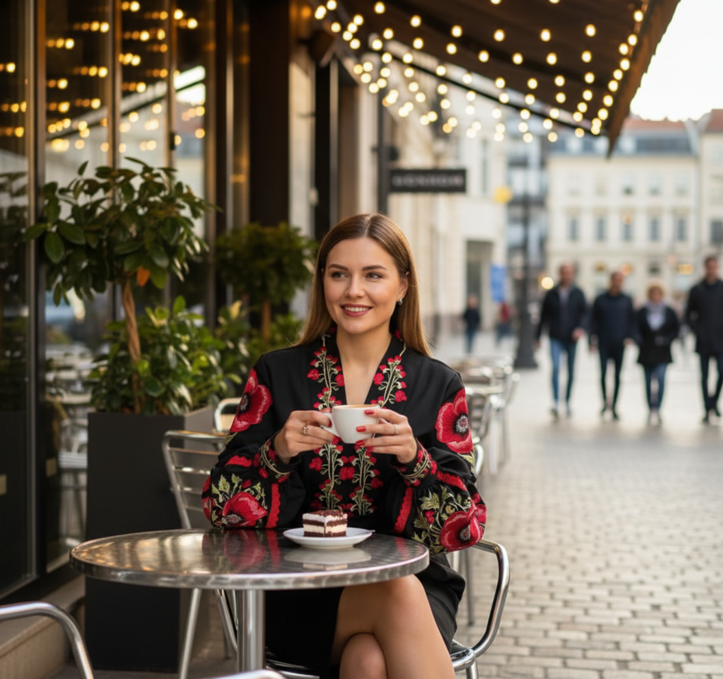 Women’s Black Embroidered Blouse with Red Poppies. Beautifully crafted from premium-quality cotton, this vyshyvanka embodies the essence of Ukrainian tradition while blending effortlessly with modern fashion.