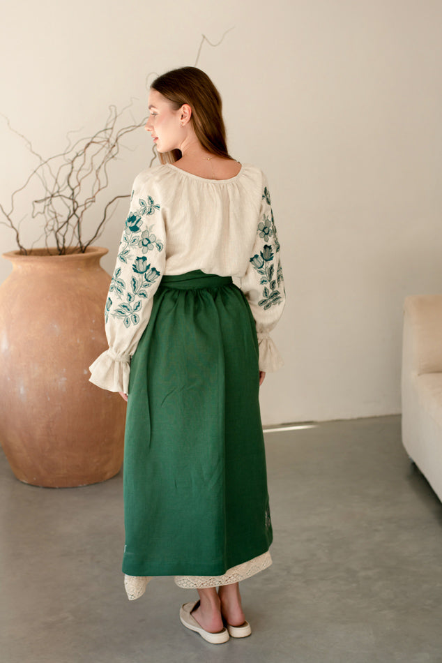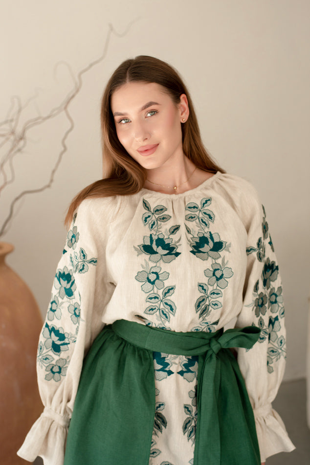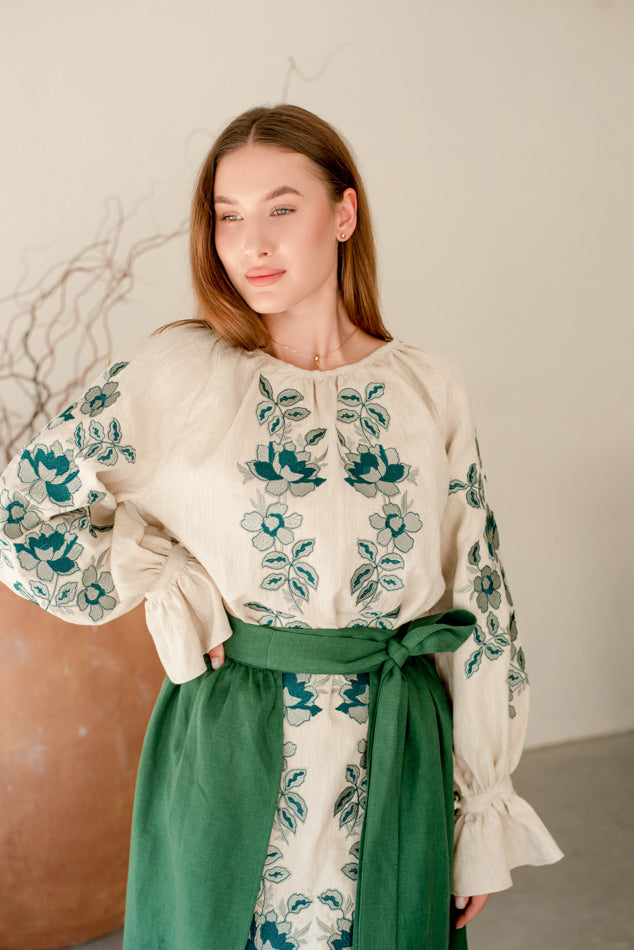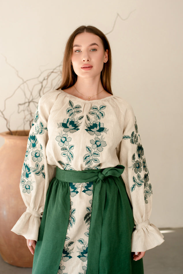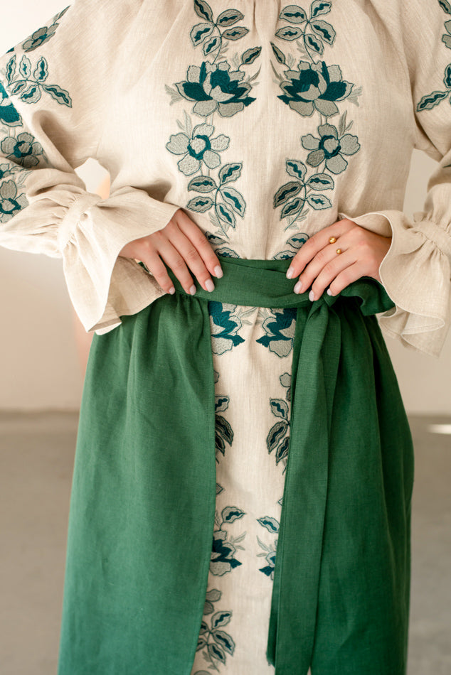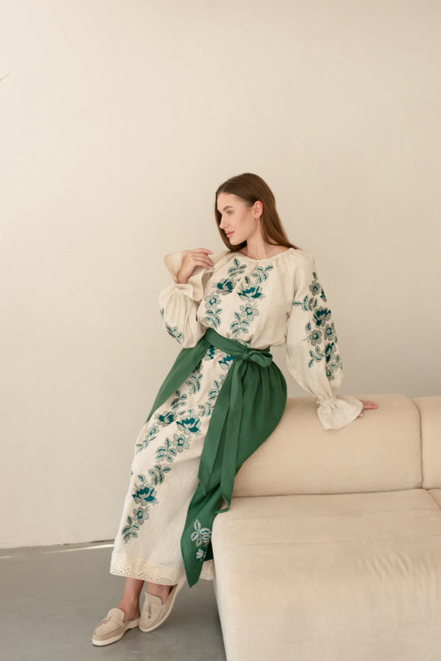 Women’s Ukrainian Embroidered Set – Long Linen Dress & Traditional Plakhta