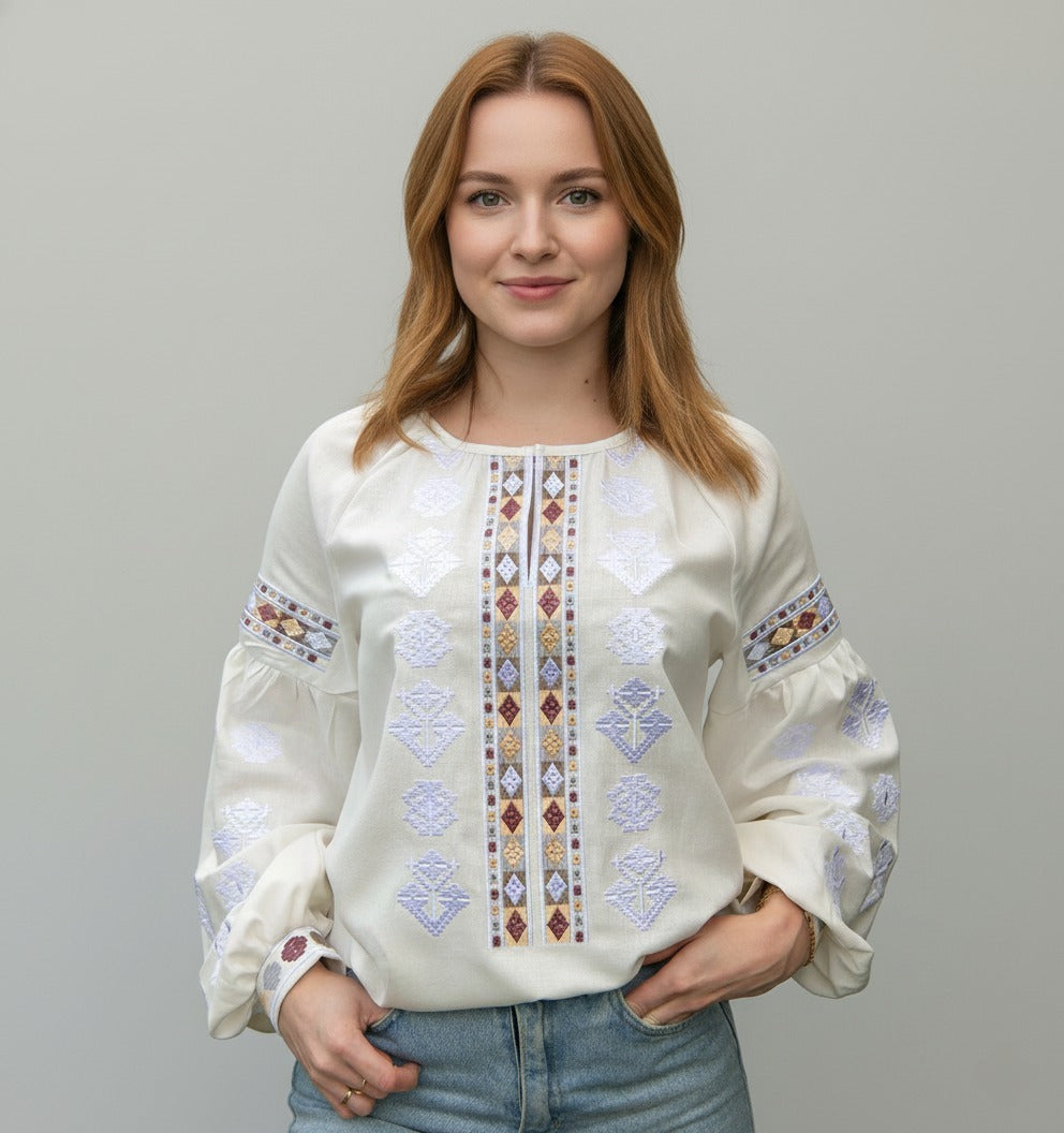 Women’s Ukrainian Embroidered Vyshyvanka Blouse – Ivory Linen Shirt