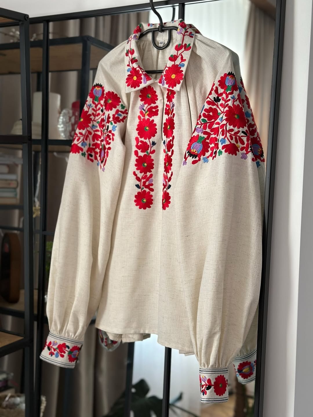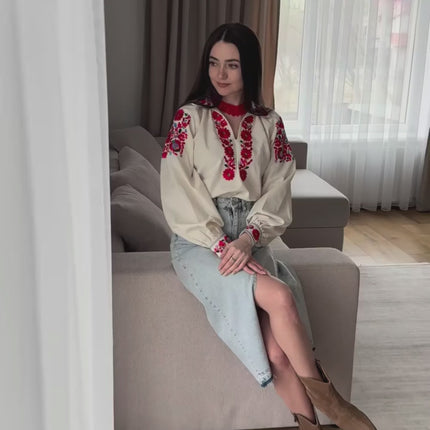 Women’s Ukrainian Linen Vyshyvanka with Red Floral Embroidery