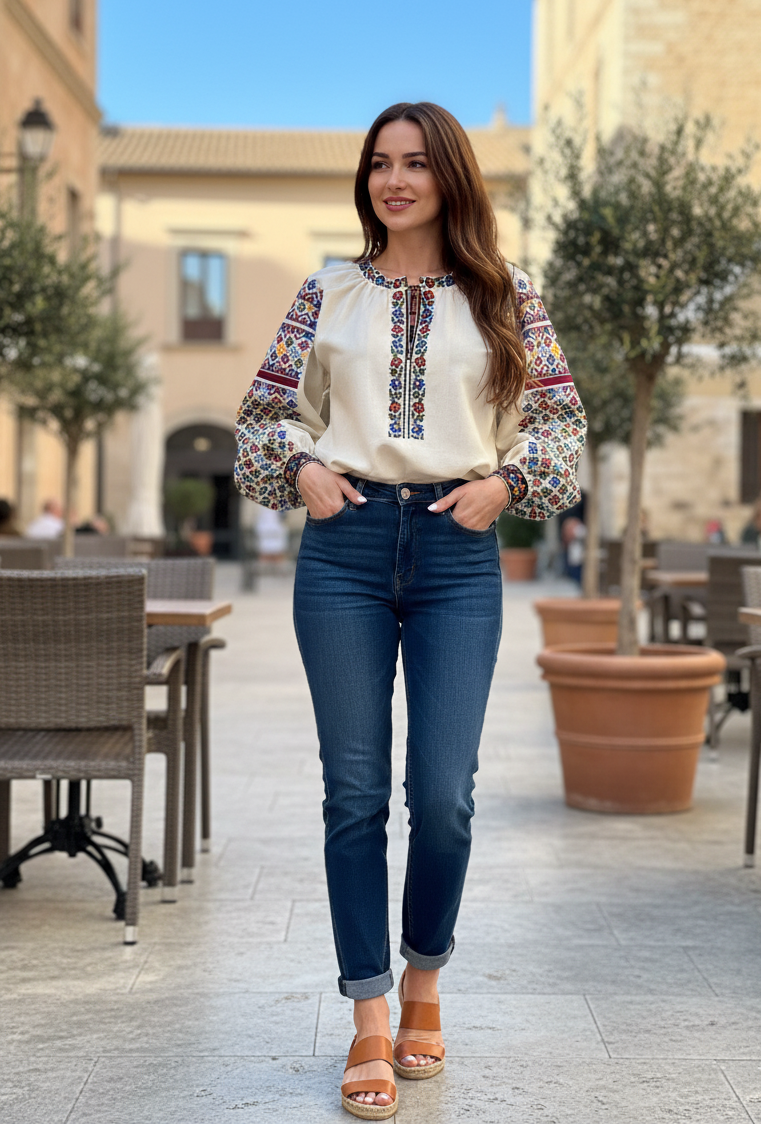 The relaxed fit and elegant design make it versatile for both everyday wear and special occasions. Pair it with jeans for a modern casual look, or with a skirt for a more traditional outfit. With its wide embroidered sleeves and intricate ornamentation, this blouse offers comfort, authenticity, and a touch of Ukrainian spirit to your wardrobe.